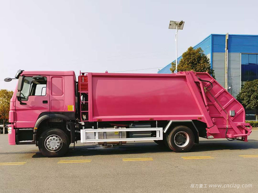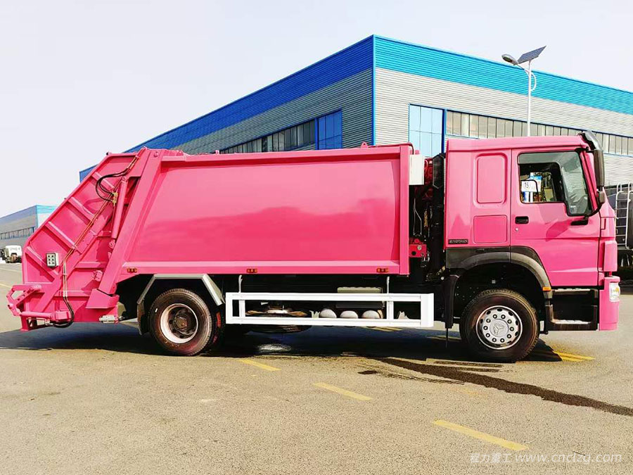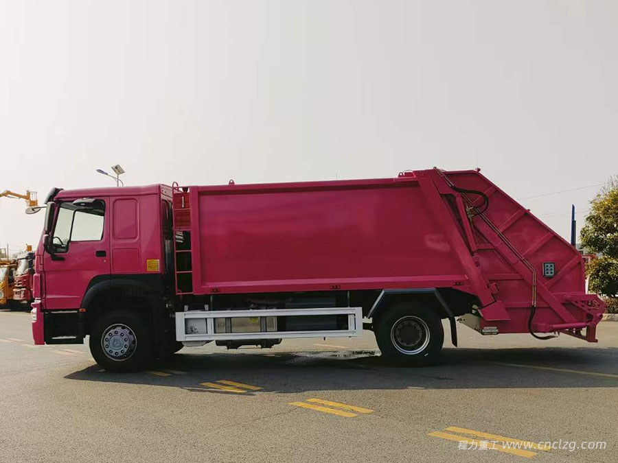 出口非洲汽重豪沃单桥压缩垃圾车,配装潍柴270发动机,16吨轮边减速后桥,1100钢丝胎,箱容体积14立方,国内一唯采用机器人自化动焊工接艺制作,套配飞油达缸,中梅多路阀等压液系统,中国工业,力程制造