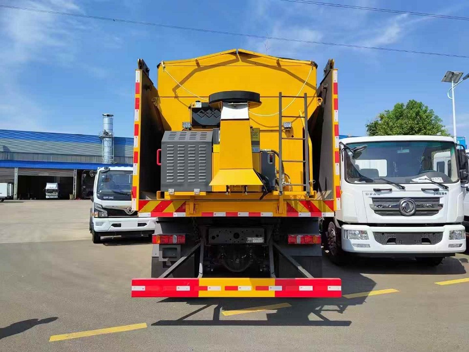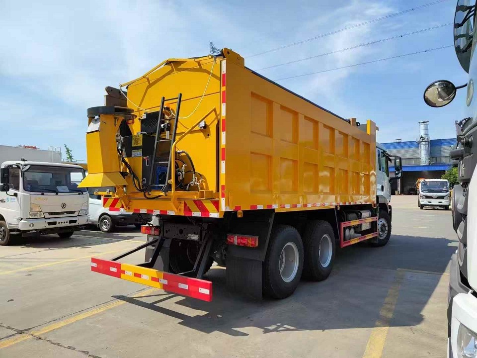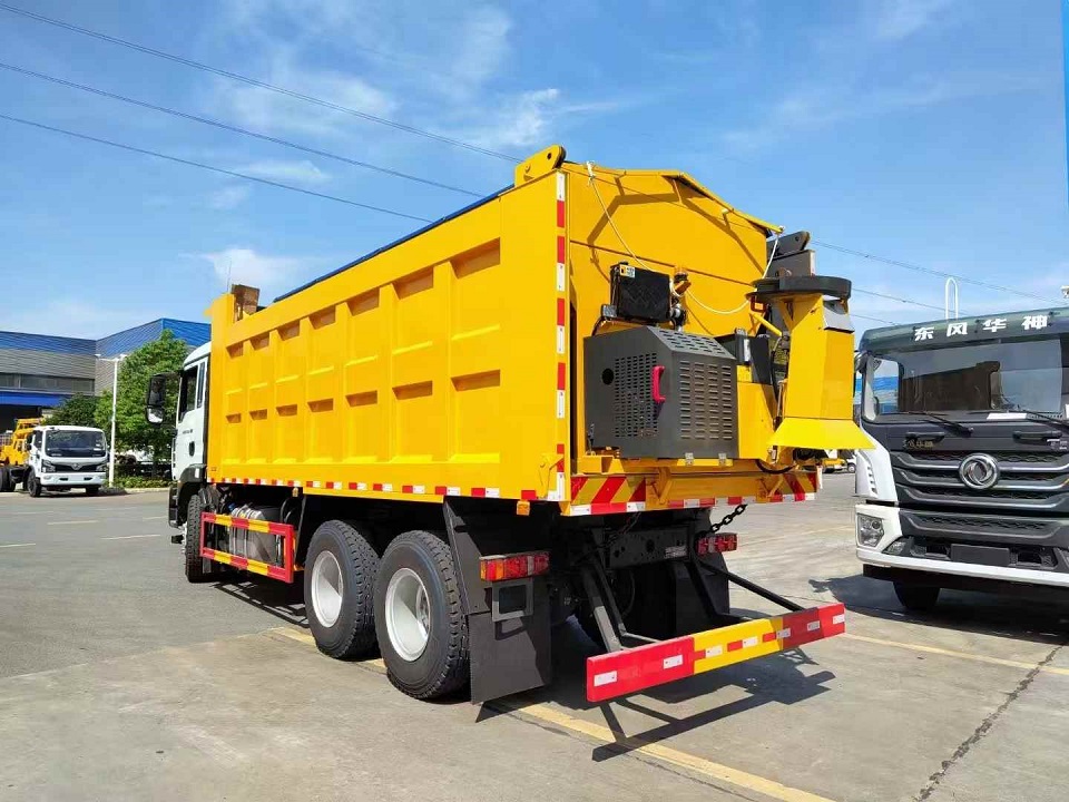 上装配置:边四底五的货箱,前置顶自卸货箱。10立方融雪撒布机,独立柴油动力,刮板链条输送方式,采用V型料仓,顶部带防雨罩,折叠式抛盘不锈钢撒布盘,采用集成按键线控驾驶室操作。3.3米分段避障除雪铲,犁板式铲面,高强度耐磨合金材质,可快速拆卸更换自带动力除雪滚使用。