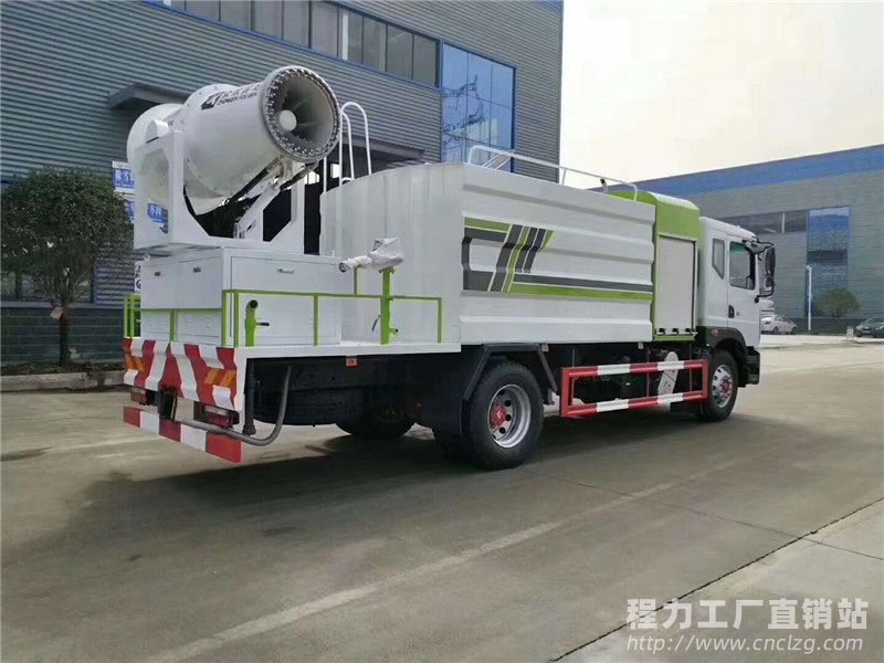 罐体容积为10方-14方,罐体采用4mm厚武钢优等碳钢板制作,内设防浪板,大功率洒水泵,可自吸水,加压排水,前冲洗,后洒压尘,侧喷花洒喷头,带65消防接口;后平台配30型、40型、50型、60型风送式雾炮机组;远程遥控系统控制;雾炮机自动旋转角度0-180°;尾部带绿化高位洒水炮,可全方位旋转,可调节成水柱状、大雨、中雨、毛毛雨等,自吸高度:≤7m,洒水宽度:≥15m;射程:≥35m,可调节成柱状,射程≥35m;也可调节成雾状,射程≥5m。可做临时消防灭火用。安装有音乐洒水喇叭。