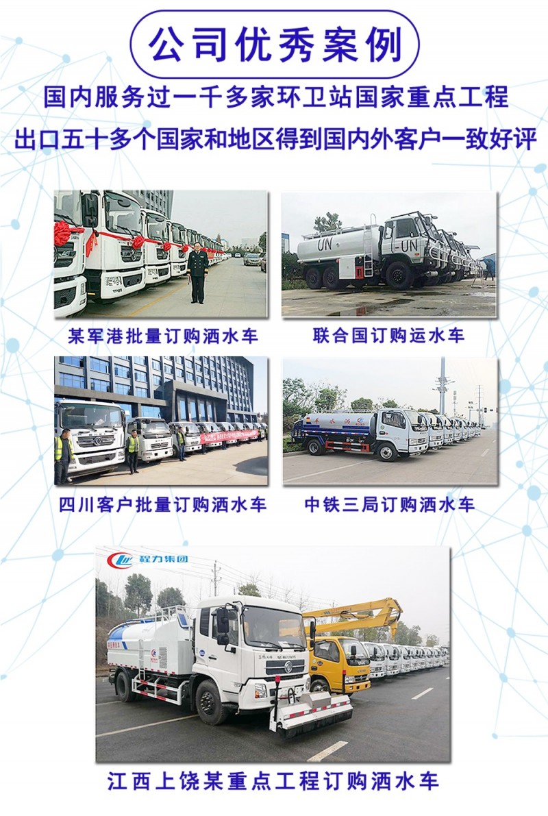 2.产品概述:该车型为东风公司最新国五排放标准。洒水车专用部分由罐体、水泵、取力器、传动轴、球阀、喷洒装置等部件组成。采用国家定型产品,具有性能稳定、工作可靠、通用适配等特点。洒水车罐体结构为椭圆形或方圆形,采用武钢优质碳钢制作,先进的对焊接工艺,罐体内设防荡防波隔板,下端有通孔,罐体成型后高压气体试漏检测,使罐体具有强度高、重心稳、车辆运载安全平稳等特点。