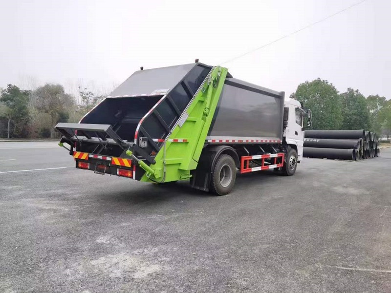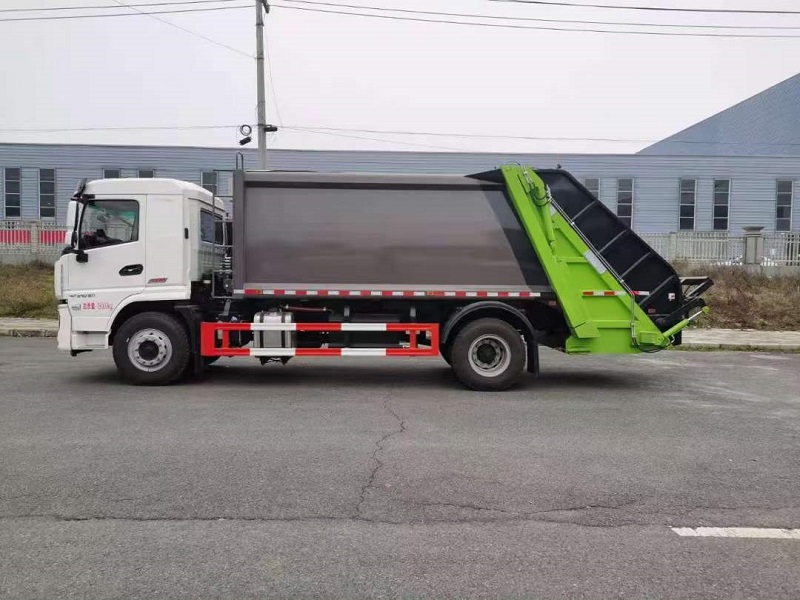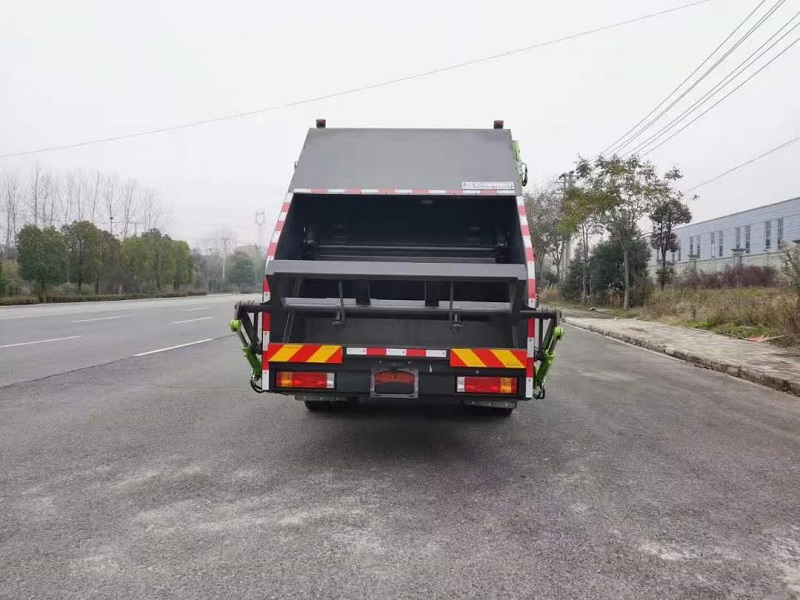 上装配置:箱体容积14方,弧形箱体(带边梁),厦门银华油缸,扬州中梅多路阀,长源液压油泵(单泵),填装器举升油缸带双向平衡阀(意大利进口阀芯),采用CAN总线电控系统(采用光电开关,带一键操作,和手动操作两种控制方式)。操作盒共贰只(驾驶室内部及后尾部右侧可操作,填充器左侧安装一个急停开关),后填装器标准下部一只污水箱(与填装器焊为整体),底盘大梁一侧一只污水箱。填充器后尾部带翻桶机构,可挂2只240L塑料垃圾桶,填装器上方安装一个工作灯.