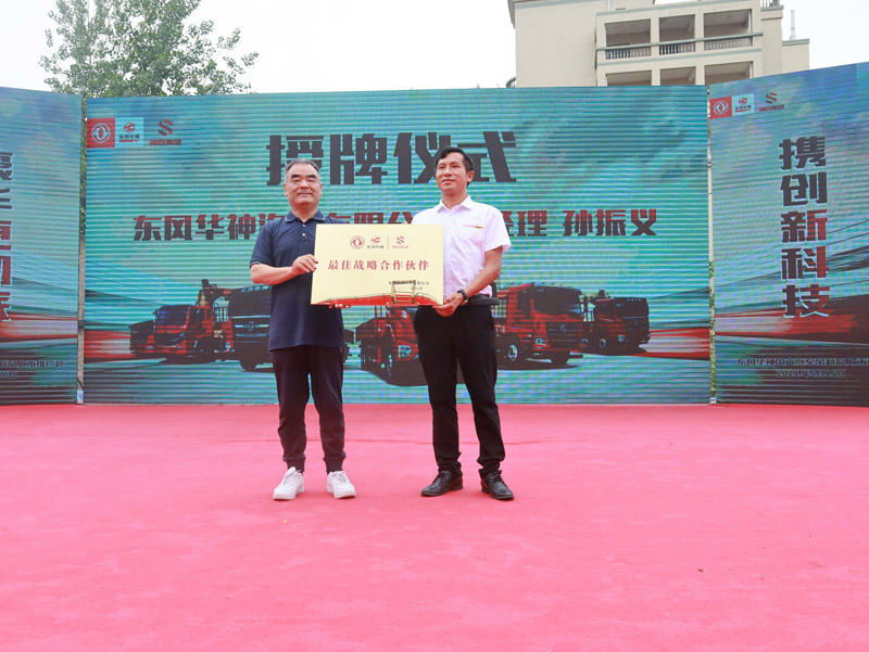 神百汽车携手东风华神,展望未来,推介会中,东风华神汽车有限公司总经理-孙振义先生向神百汽车集团董事长白贵涛先生进行了授版仪式,达成最佳佳战略合作伙伴。
