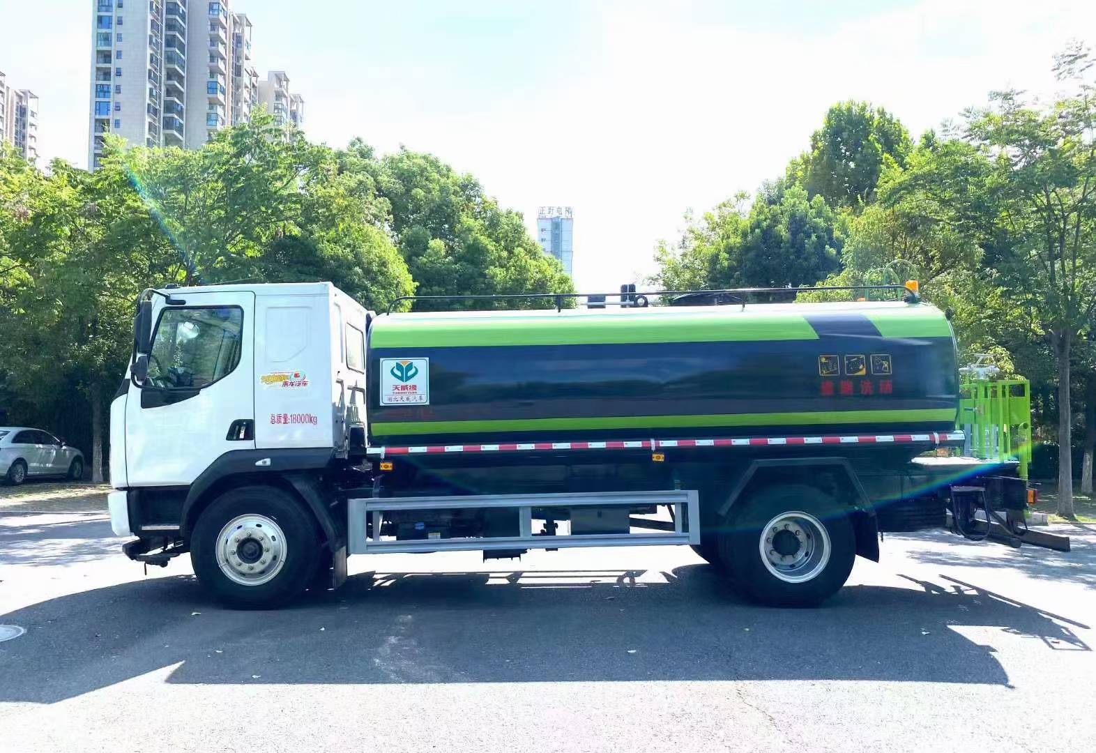 罐体采用4mm厚碳钢板制作,容积约14立方米,配杭州威龙水泵(可泵进泵出),带前冲、后洒、侧喷,罐体右侧靠尾部带两个高位花洒,后工作平台为冲孔平台,防滑式踏板,带绿化洒水高炮,水位计,球阀式消防栓接口和DN65泵进出口装在副驾驶一侧,正驾驶尾部一个球阀式消防栓上水口(管道伸入罐体内2/3高度位置),正驾驶尾部一根直径65与后保险杠等长的喷水管(直径65的管钻两排孔朝下喷水),整车全通径球阀,主管道直径80,其余出口为65,一个工具箱,后尾部管道左右各一个1寸的洗手阀,罐尾左右各一个圆警灯,两根与罐体等长的输水管,其余为工厂标准配置。