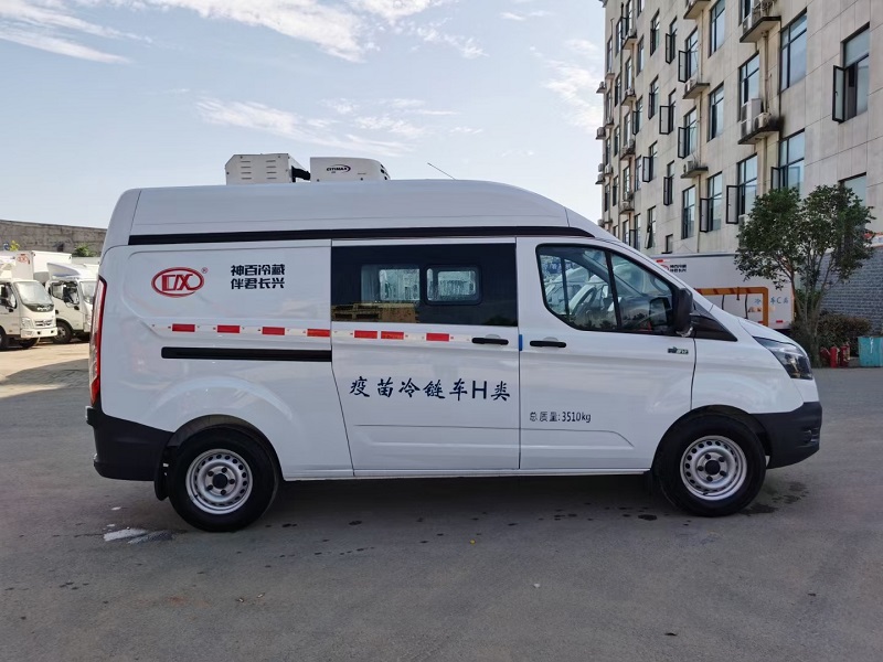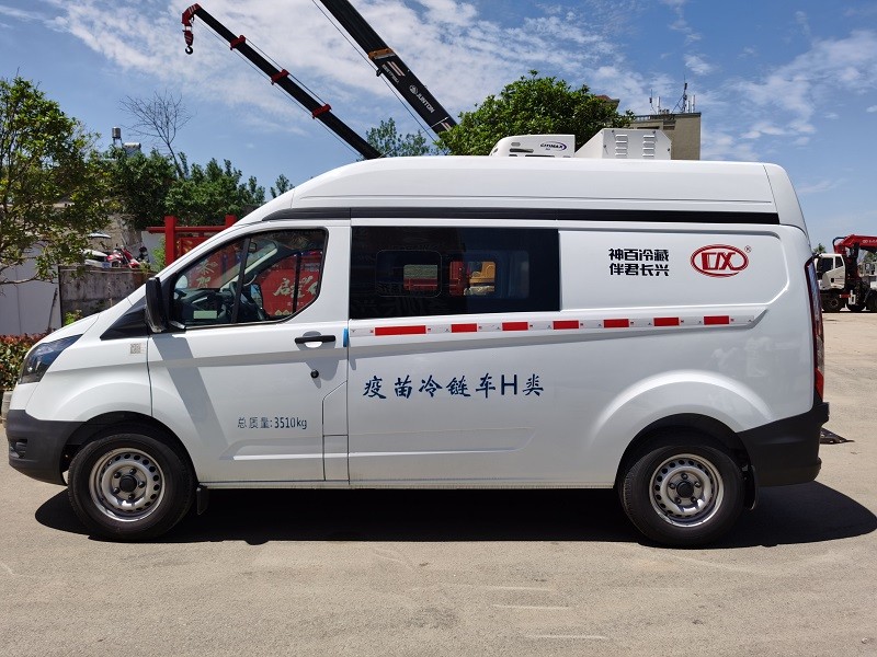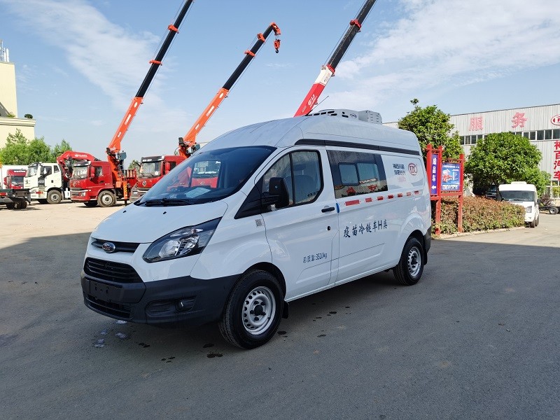 福特新全顺疫苗冷链车,双排,单排,柴油,汽油,厢体外部有机玻璃钢,中间保温层,内部为食品级304不锈钢,四面通风槽,不锈钢门锁件,标配上海松寒冷机,温湿度计录仪等.