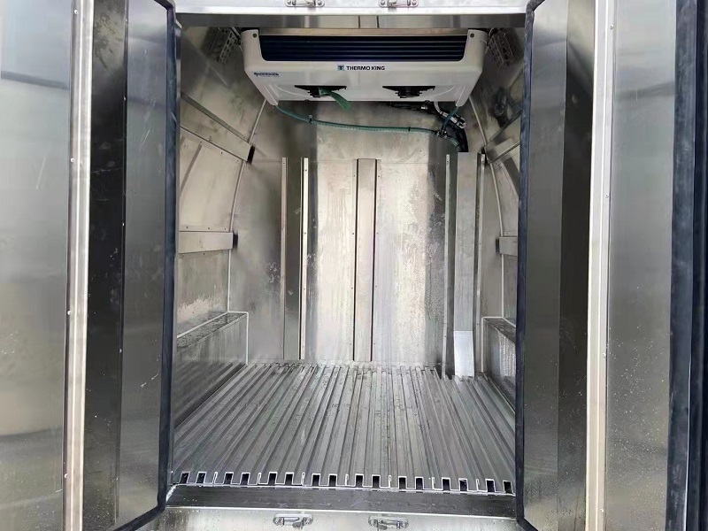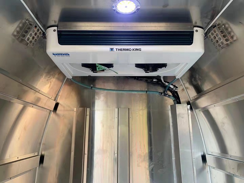制冷机组只有单冷功能,温度可达-18°C;在配备加热系统功能条件下,冷藏箱温度可控制在-18°C到+20°C之间;采用12v电压、用量为1.1kg的R404A制冷剂、热气除霜方式;在环境温度为35°C的情况下,6m3的厢体达到0°C只需45分钟,达到-18°C只需120分钟。